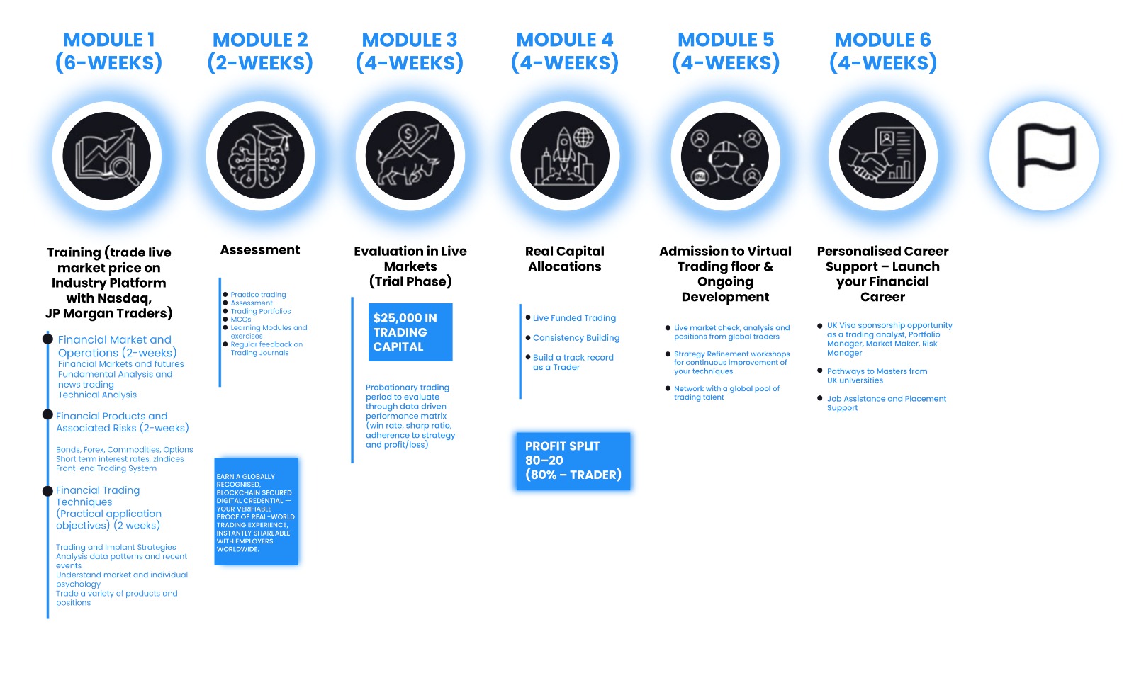Every learner progresses into a structured 6-month trading internship, designed to replicate junior trader programmes followed by UK prop firms.